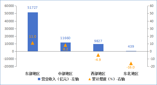 上半年,規模以上電子信息制造業東部地區實現營業收入51727億元,同比增長11%,較1-5月份回落0.5個百分點;中部地區實現營業收入11660億元,同比增長8.2%,較1-5月份回落0.2個百分點;西部地區實現營業收入9827億元,同比下降4.9%,較1-5月份回落1.6個百分點;東北地區實現營業收入438.5億元,同比下降16%,較1-5月份提高5.7個百分點。6月份,東部地區實現營業收入10122億元,同比增長8.9%,中部地區實現營業收入2187億元,同比增長7.4%;西部地區實現營業收入1715億元,同比下降12%;東北地區實現營業收入94.8億元,同比增長13.9%。
