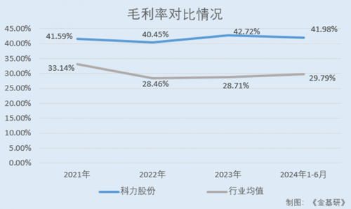 毛利率方面,2021-2023年及2024年1-6月,科力裝備毛利率分別為41.59%、40.45%、42.72%、41.98%,整體維持在40%以上的高位。