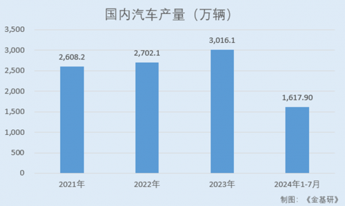 據中汽協數據,2021-2023年,全國汽車產量分別為2,608.2萬輛、2,702.1萬輛、3,016.1萬輛。其中,2023年,全國汽車產量同比增長11.6%,產量創歷史新高。到2024年1-7月,全國汽車產量為1,617.9萬輛,同比增長3.4%。