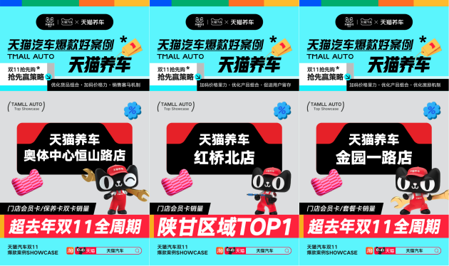 對于高度依賴服務質量、人群口碑的養車行業來說,以線下超強福利政策帶動線上突破,更是大促制勝的秘籍。天貓養車奧體中心恒山路店以全面觸達潛在人群的新思路和完善的賽馬機制,不斷沉淀忠誠人群,截止10月22日,會員卡/保養卡雙卡銷售已經超過去年整個雙11。天貓養車紅橋北店將會員卡與免費洗車、保養套餐相結合,雙11階段會員卡銷售位列陜甘區域第一。天貓養車金園一路店優化產品組合與激勵機制,門店會員卡銷量登全國TOP1。