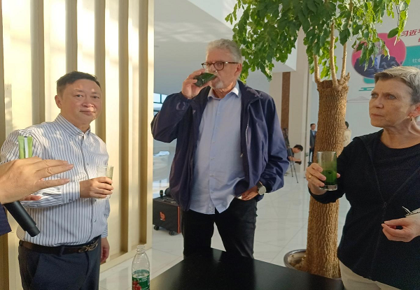 (ISO/TC 234委員會主席奧托·格雷格森與高志剛董事長共飲公司的小球藻固體飲料)