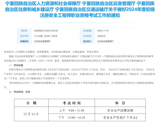 核心提示:臨近年底,好消息傳來!今日,寧夏回族自治區官方已發布初級注冊安全工程師首考通知。臨近年底,好消息傳來!今日,寧夏回族自治區官方已發布初級注冊安全工程師首考通知。河南中安建培教育提醒,考試采取網上報名的方式,報名時間為2024年11月14日9點0——11月20日23點,本次考試不設補報名,請報考人員務必在規定時間內完成全部報名手續,避免錯過寧夏初級注安首考。首次開啟考試,一般都具有重大意義。初級注冊安全工程師考試也將為寧夏地區篩選安全專業人才,為安全生產行業帶來新的活力與機遇。注冊安全工程師職業資格制度的推行,旨在加強安全生產專業技術人才隊伍建設,提高安全生產專業技術人員能力素質,為安全生產工作提供有力的人才支撐。初級注冊安全工程師考試的開啟,進一步完善了注冊安全工程師職業資格體系,為那些處于職業生涯起步階段的安全工程專業人員提供了一個明確的職業發展路徑。
