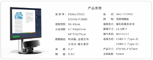 采用雙相機方案,通過主、輔相機分別獲取眼面部圖像和人眼快速ROI(Region of Interest)以形成極高的幀率(≥500Hz);公司自研的DVS傳感器在只捕捉運動信息的情況下也能輸出低像素圖并形成極高的幀率(≥500Hz)。