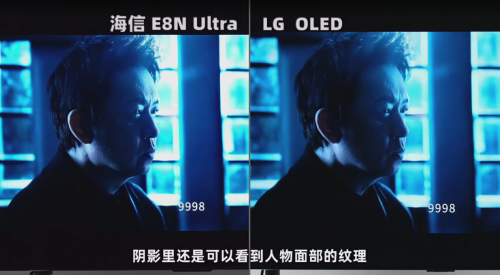 并且,基于E8N Ultra本身的高亮度,再結(jié)合AI對(duì)比度增強(qiáng),可讓亮場畫面更加通透清楚、暗部也更加純凈有細(xì)節(jié)。即使與OLED電視對(duì)比, “關(guān)隊(duì)”在警局被審問時(shí),面部的倫勃朗光被準(zhǔn)確呈現(xiàn),而且陰影過渡更加自然,層次也更多。而AI清晰度算法的加持,使得即使逆光下的人臉,陰影中面部的小疙瘩、汗毛等細(xì)節(jié)依然清晰可見。
