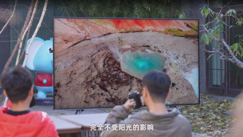 實(shí)測中,用專業(yè)攝影燈斜向投射一束光去照射電視屏幕,畫面幾乎感受不到干擾,這也說明日常燈光環(huán)境下其觀看完全沒問題。為了進(jìn)一步驗(yàn)證抗光反能力,博主直接把百吋E8N Ultra搬到了灑滿陽光的院子里,其不管播放明媚的歐洲風(fēng)光片、暗黑色調(diào)的《白夜破曉》還是激情四射的球賽,都完全不受陽光干擾,畫面足夠清晰通透,且不受觀看視角限制,非常適合約上三五好友一起追劇、看球。