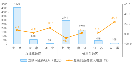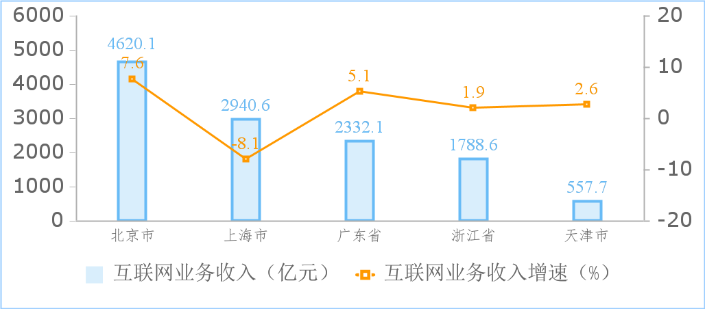 超半數(shù)地區(qū)互聯(lián)網(wǎng)業(yè)務(wù)收入實(shí)現(xiàn)正增長(zhǎng)。1-10月,互聯(lián)網(wǎng)業(yè)務(wù)累計(jì)收入居前5名的北京(增長(zhǎng)7.6%)、上海(下降8.1%)、廣東(增長(zhǎng)5.1%)、浙江(增長(zhǎng)1.9%)和天津(增長(zhǎng)2.6%)共完成業(yè)務(wù)收入12239億元,同比增長(zhǎng)1.9%,占全國(guó)(扣除跨地區(qū)企業(yè))互聯(lián)網(wǎng)業(yè)務(wù)收入的82.9%。全國(guó)互聯(lián)網(wǎng)業(yè)務(wù)收入實(shí)現(xiàn)正增長(zhǎng)的。▍^(qū)、市)有16個(gè),其中甘肅、貴州、安徽增速超20%,西藏、吉林、新疆、山西降幅超20%。