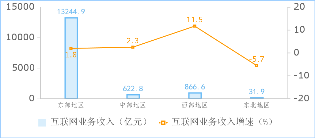 西部地區(qū)互聯(lián)網(wǎng)業(yè)務(wù)收入增速領(lǐng)先。1-10月,東部地區(qū)完成互聯(lián)網(wǎng)業(yè)務(wù)收入13245億元,同比增長(zhǎng)1.8%,低于全國(guó)增速0.5個(gè)百分點(diǎn),占全國(guó)互聯(lián)網(wǎng)業(yè)務(wù)收入的89.7%。中部地區(qū)完成互聯(lián)網(wǎng)業(yè)務(wù)收入622.8億元,同比增長(zhǎng)2.3%,與全國(guó)增速持平。西部地區(qū)完成互聯(lián)網(wǎng)業(yè)務(wù)收入866.6億元,同比增長(zhǎng)11.5%。東北地區(qū)完成互聯(lián)網(wǎng)業(yè)務(wù)收入31.9億元,同比下降5.7%。