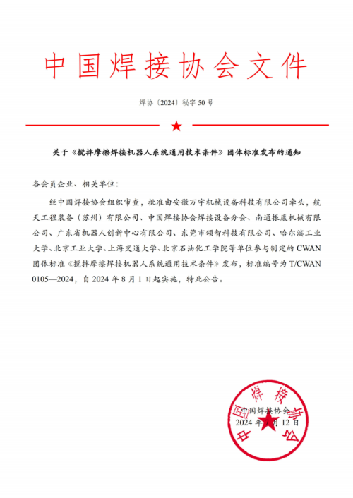 核心提示:此標準聚焦于攪拌摩擦焊接——這一引領綠色制造潮流、融合卓越品質與高效能于一體的先進焊接技術,該技術正迅速滲透至航空航天、電力電子、軌道交通及新能源汽車等尖端制造領域,成為鋁、鎂、銅、鈦等有色金屬材料加工不可或缺的創新工藝。《攪拌摩擦焊接機器人系統通用技術條件》(T/CWAN 0105-2024)團體標準,由中國焊接協會焊接設備分會專家委員會提出并組織編制,安徽萬宇機械設備科技有限公司牽頭起草,于2024年7月12日正式對外發布,2024年8月1日起實施。此標準聚焦于攪拌摩擦焊接——這一引領綠色制造潮流、融合卓越品質與高效能于一體的先進焊接技術,該技術正迅速滲透至航空航天、電力電子、軌道交通及新能源汽車等尖端制造領域,成為鋁、鎂、銅、鈦等有色金屬材料加工不可或缺的創新工藝。
