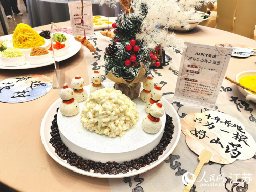比賽現場展示的河蝦仁山藥土豆泥。人民網 江楠攝