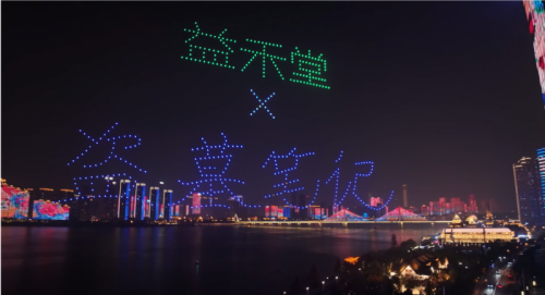 12月19日19點30分,無人機表演在長沙岳麓區(qū)濱江景觀道亮相。夜空中,無人機組成的“云頂茶香 益定重逢”的文字形狀和Q版《盜墓筆記》人物角色以及“堂堂”的造型在夜空中閃耀,將《盜墓筆記》與益禾堂的元素完美結(jié)合,為市民們帶來了一場視覺盛宴。