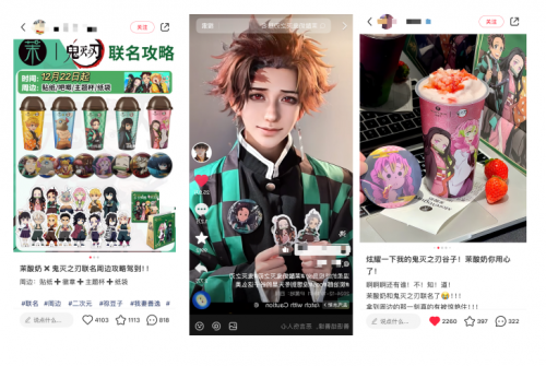 《鬼滅之刃》作為史上銷量最快的億冊漫畫之一,引進中國后,也創下多項人氣記錄,成為眾多餐飲品牌爭搶合作的“香餑餑”。繼肯德基后,12月,茉酸奶與其進行聯名合作,推出了一系列的聯名套餐、周邊禮物,甚至是線下的主題門店,這使得茉酸奶也成為中國大陸地區第一個與《鬼滅之刃》聯名的新茶飲品牌。本次聯名在小紅書和抖音平臺也獲得了眾多動漫迷的追捧。