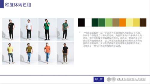 并且在休閑系列中,不同飽和度的綠色,搭配高明度的黃色,低明度的藍色,就會打造出現代男士既清新又沉穩的著裝風格。這種配色讓人聯想到自然環境中的多樣性,適合在休閑裝中展現出一種活力與舒適的平衡,既富有動感,又具備內斂的質感。