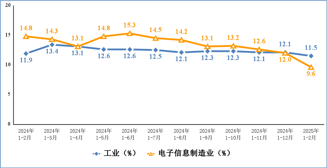 1-2月,電子信息制造業固定資產投資同比增長9.6%,較2024年回落2.4個百分點,比同期工業投資增速低1.9個百分點,比同期高技術制造業投資增速高9.6個百分點。