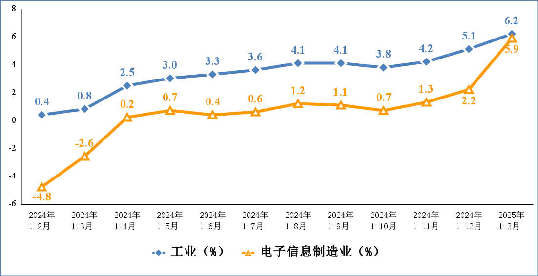 1-2月,規模以上電子信息制造業累計實現出口交貨值同比增長5.9%,較2024年提高3.7個百分點。