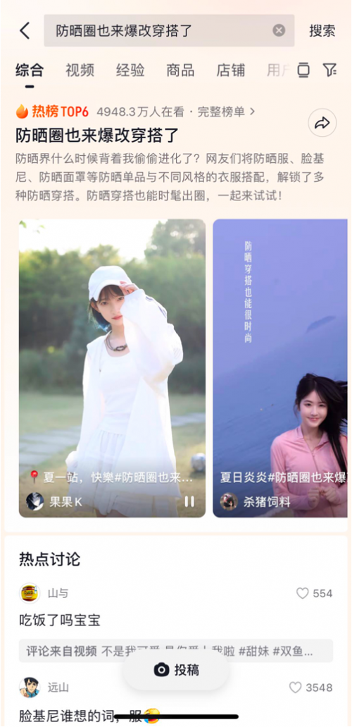 貼近消費者生活場景的好內容,往往能觸動用戶的分享熱情,令用戶在互動中加深對產品、品牌的興趣。平臺為助力商家擴大影響力,通過系列熱點的挖掘,引發明星達人、商家到用戶的投稿,全民參與提升防曬好物內容影響力,形成濃烈戶外防曬氛圍。