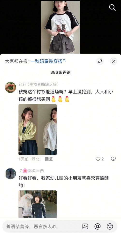 在好內容引發搜索興趣后,商家布局小藍詞資源,在評論區吸頂詞、底BAR植入“品牌詞、產品詞”等相關搜索詞,持續激發用戶搜索,將更多A1、A2人群轉化為A3、A4人群。例如,童裝品牌麥麥秋主理人在店鋪直播前發布系列種草視頻,觸發“一秋媽童裝穿搭”小藍詞,帶動品牌搜索提升超30%。