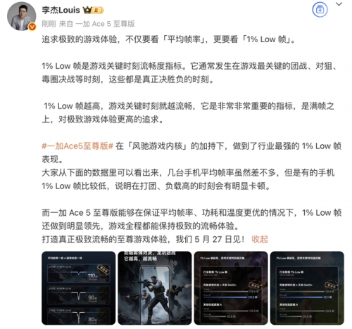 一加中國區總裁李杰表示:“1% Low 幀是游戲關鍵時刻流暢度指標。它通常發生在游戲最關鍵的團戰、對狙、毒圈決戰等時刻,這些都是真正決勝負的時刻。1% Low 幀越高,游戲關鍵時刻就越流暢,它是非常非常重要的指標,是滿幀之上,對極致游戲體驗更高的追求。一加 Ace 5 至尊版,在「風馳游戲內核」的加持下,做到了行業最強的 1% Low 幀表現。”