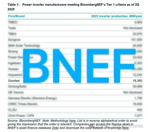 核心提示:近日,彭博新能源財經(jīng)(BloombergNEF,以下簡稱“BNEF”)公布了2025年第二季度全球一級光伏逆變器制造商名單,固德威憑借其可靠的產(chǎn)品和解決方案、穩(wěn)健的國際化步伐以及卓越的品牌口碑成功入選榜單。近日,彭博新能源財經(jīng)(BloombergNEF,以下簡稱“BNEF”)公布了2025年第二季度全球一級光伏逆變器制造商名單,固德威憑借其可靠的產(chǎn)品和解決方案、穩(wěn)健的國際化步伐以及卓越的品牌口碑成功入選榜單。此次入選BNEF Tier 1榜單,不僅是對固德威過往成績的高度認可,也彰顯了其在全球光伏逆變器市場的重要地位和強大競爭力。