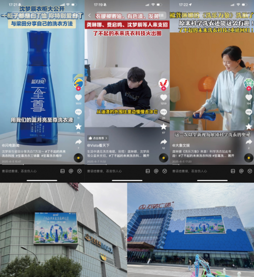 此外,「了不起的未來洗衣科技 Ⅱ」借力平臺資源,聯(lián)動新華網(wǎng)客戶端官方賬號、眾多媒體矩陣,在站外多端同步進行宣傳,站外總曝光超5.6億。同時,在線下萬達廣場LED大屏投放品牌物料,吸引消費者上抖音搜索藍月亮”至尊洗衣三錦囊”。