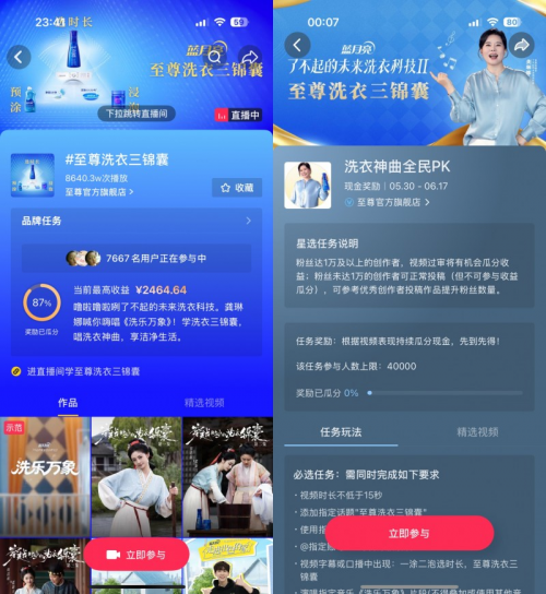 活動通過打造音樂MV、微短劇、微綜藝等定制化品牌內(nèi)容,讓消費者在沉浸式互動中,深度感知藍月亮的科技力與科學(xué)洗衣的精髓;依托平臺資源,與明星達人、媒體建立高效合作,幫助品牌實現(xiàn)全域精準(zhǔn)觸達、滲透目標(biāo)人群,將“科學(xué)洗衣”的理念從認知浸潤至行動自覺。