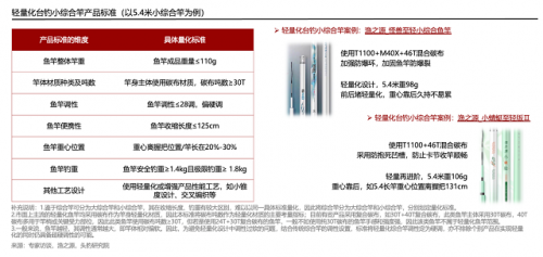 此外值得注意的是,此次漁之源發布的《輕量化垂釣白皮書》中,首次明確定義了輕量化垂釣裝備的產品標準,例如輕量化臺釣小綜合竿需滿足“魚竿成品重量≤110g,收縮長度≤120cm,安全釣重≥1.4kg且極限釣重≥1.8kg”等詳細數據要求。
