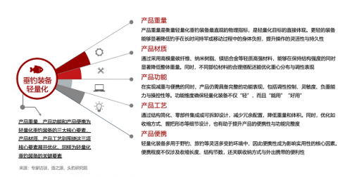 關于輕量化垂釣裝備的產品要素,《輕量化垂釣白皮書》中也給出了適用標準,其中1.產品重量、2.產品功能和3.產品便攜為輕量化垂釣裝備的三大核心要素。產品材質、產品工藝則圍繞這三項核心要素展開優化,同樣為輕量化垂釣裝備的關鍵要素。