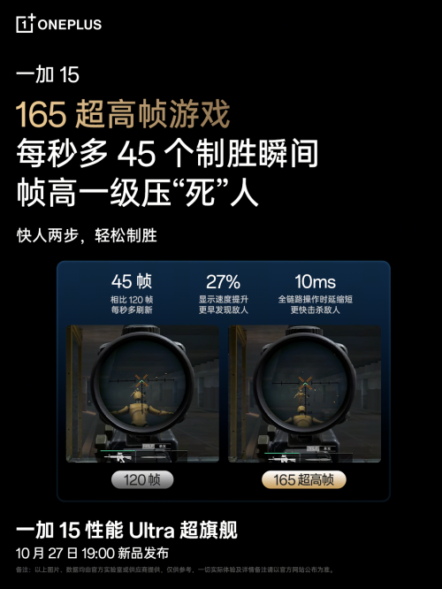 此外,得益于「風馳游戲內核」出色的性能調度,一加 15 率先在行業帶來了 165 超高幀游戲體驗,并行業首個實現主流游戲 165 幀無限滿幀。相比主流的 120 幀,165 幀每秒可多輸出 45 幀畫面,顯示速度更快,觸顯響應速度也大幅提升。在分秒必爭的 FPS 游戲中,一加 15 能助力玩家早一步發現敵人,先敵一步開鏡開槍,快人兩步,輕松制勝,是名副其實的「槍神」首選。