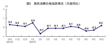10月份,全國居民消費價格(CPI)同比上漲0.2%,上月為下降0.3%;環比上漲0.2%。分類別看,食品煙酒價格同比下降1.6%,衣著價格上漲1.7%,居住價格上漲0.1%,生活用品及服務價格上漲1.9%,交通通信價格下降1.5%,教育文化娛樂價格上漲0.9%,醫療保健價格上漲1.4%,其他用品及服務價格上漲12.8%。在食品煙酒價格中,豬肉價格下降16.0%,鮮菜價格下降7.3%,鮮果價格下降2.0%,糧食價格下降0.7%?鄢称泛湍茉磧r格后的核心CPI同比上漲1.2%,漲幅比上月擴大0.2個百分點。1—10月份,全國居民消費價格同比下降0.1%。