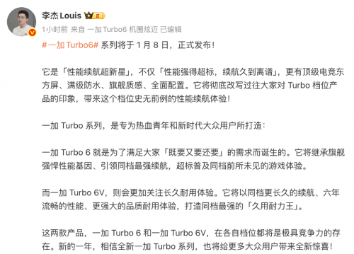 一加 Turbo 6 系列官宣定檔1月8日:全面超檔的性能續(xù)航超新星