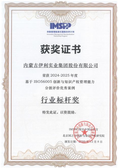 近日,伊利股份作為全國食品行業首批獲得“創新與知識產權管理”國際標準ISO56005最高認證等級(四級)的企業,在2025年度由ISO56005國際標準中國運營方組織的“創新與知識產權管理能力分級評價優秀案例”全國評選中,榮獲食品行業唯一的“行業標桿”獎,成為全國創新與知識產權管理能力建設的一面旗幟,樹立食品行業創新管理新標桿。