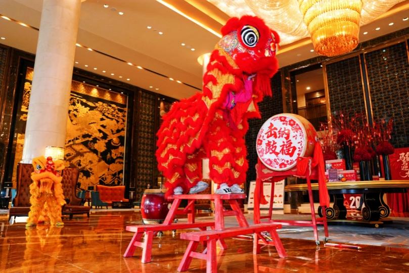 瑞獸吐彩,傳遞美好祝福,上樁、跳躍......靈動表演獲得滿堂喝彩。祥獅穿堂過廊,踏遍太原富力萬達文華酒店每一處角落,頷首拜年,嬉戲逗趣,賓客駐足合影,孩童歡逐其后,瑞獅所至,福氣隨行。